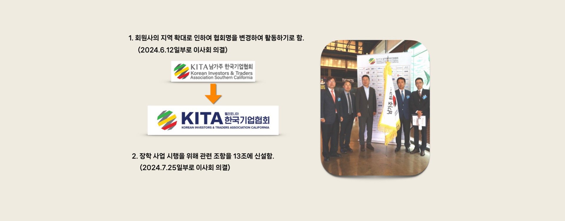 캘리포니아한국기업협회(KITA)는 남가주에 진출한 상사. 지사들 의 권익도모와 사업환경개선을 위해 1980년대 초에 설립 되었으며 1996년에 법인으로 전환하여 체계적인 활동을 지속하여 왔습니다. 주류사회 인사들과 교류로 2008년 한미 FTA 협정 체결에 일익을 담당하였으며 2012년 협정 발효 이후 에도 FTA의 효율적 이용과 확대를 위한 계몽사업을 전개하고 있습니다........