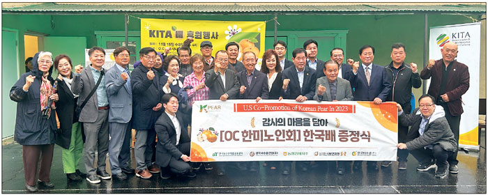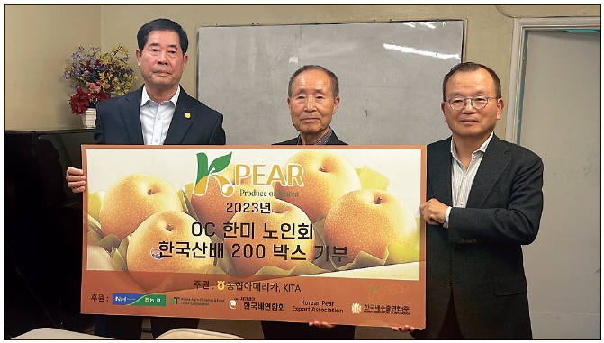 남가주 한국 기업협회(KITA, 회장 신현수), 농협 아메리카, aT한국 농수산 식품 유통공사, 한국배 수출연합(주), 농업경제 지주, 사단법인 한국배 연합회, 한국배 수출 주식회사 등 한국 단체들은 지난 15일 오후 가든그로브 한인타운에 있는 OC한미 시니어센터(회장 김가등)를 방문해 한국배 200상자를 전달했다.