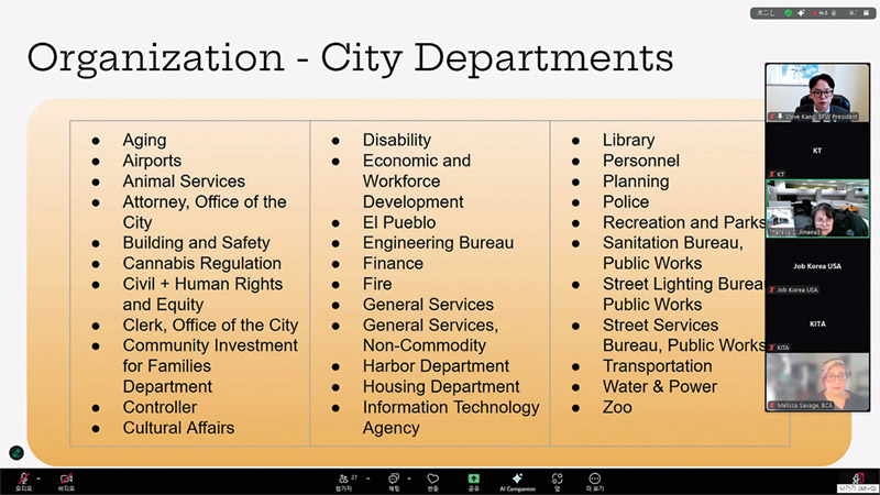 가주한국기업협회(KITA·회장 김한수)는 13일 ‘LA시 조달사업 프로세스 및 참여 전략’을 주제로 온라인 설명회를 열었다. 이날 세미나는 LA 공공사업위원회 의장인 스티브 강이 직접 사회를 맡았고, LA시 담당자 2명이 패널로 참여해 시의 조달 구조와 실제 입찰 절차를 구체적인 사례와 함께 설명했다.