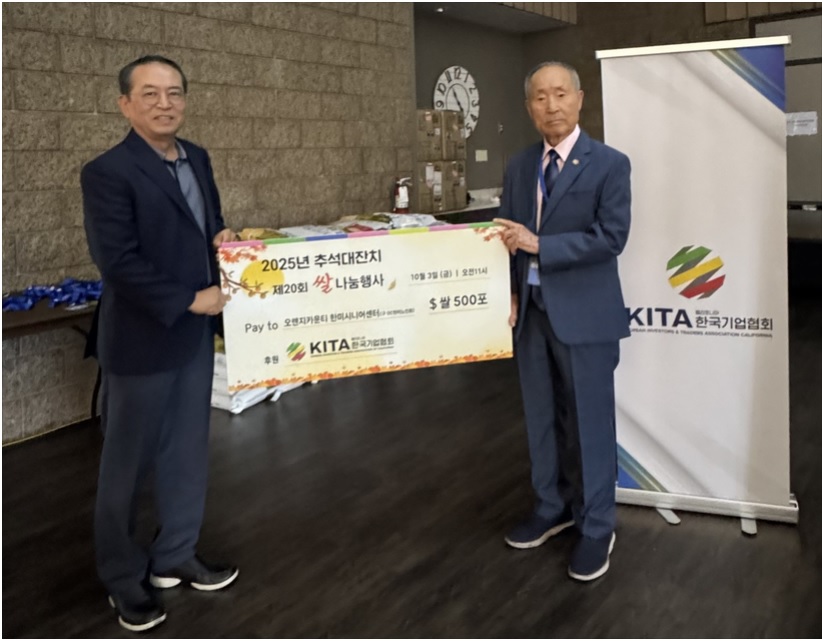 캘리포니아한국기업협회(KITA·회장 김한수)는 지난 3일 오전 11시 오렌지카운티 한미시니어센터에서 ‘제20회 사랑의 쌀 나눔’ 행사를 개최했다. 가주 한인 시니어의 날과 한가위 대잔치를 맞아 열린 이날 행사에서 KITA는 쌀 500포를 전달했다. 이석준 KITA 수석 부회장이 김가등 오렌지카운티 한미시니어센터 회장(오른쪽)에게 쌀 기부서를 건네고 있다. [KITA 제공]